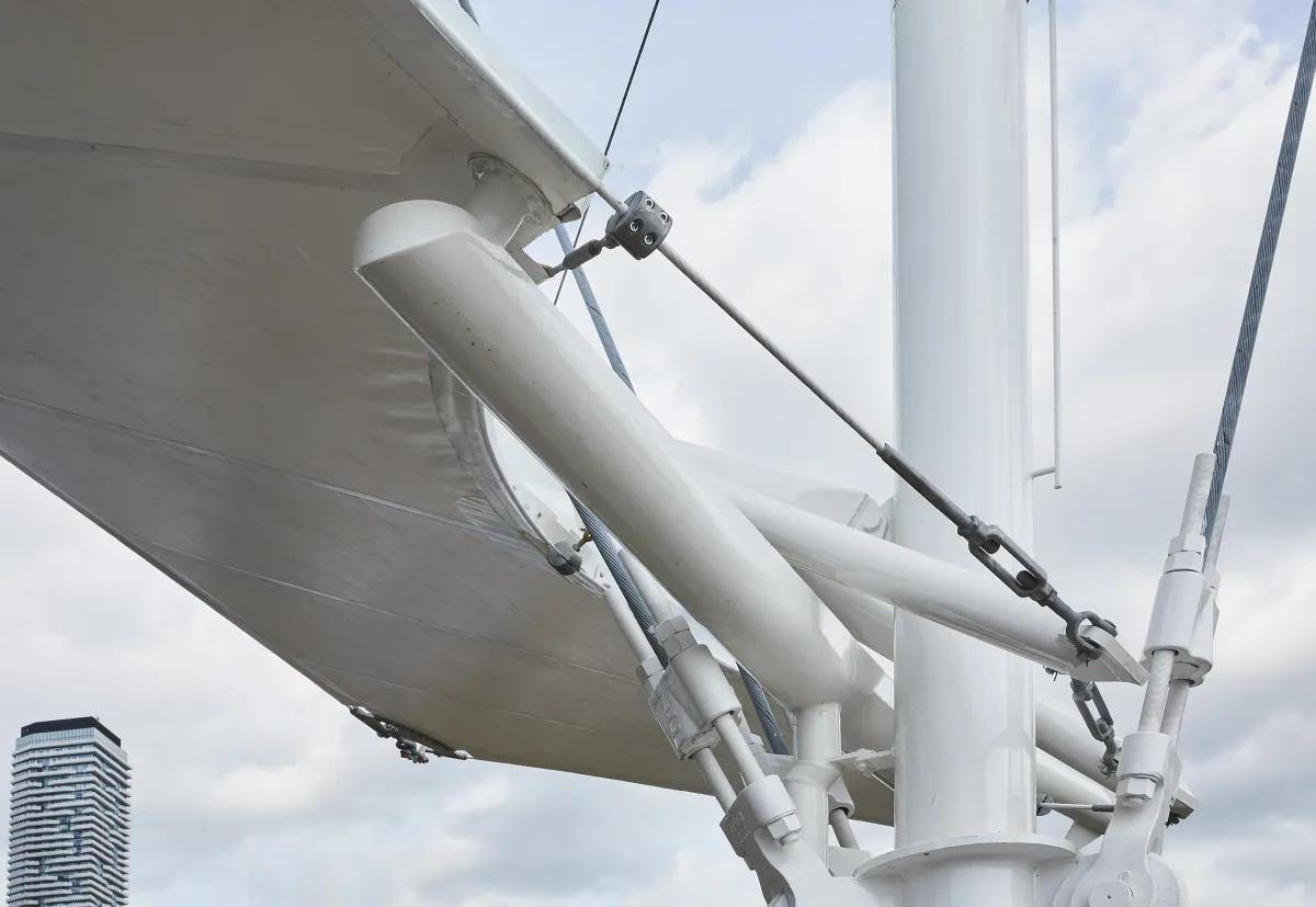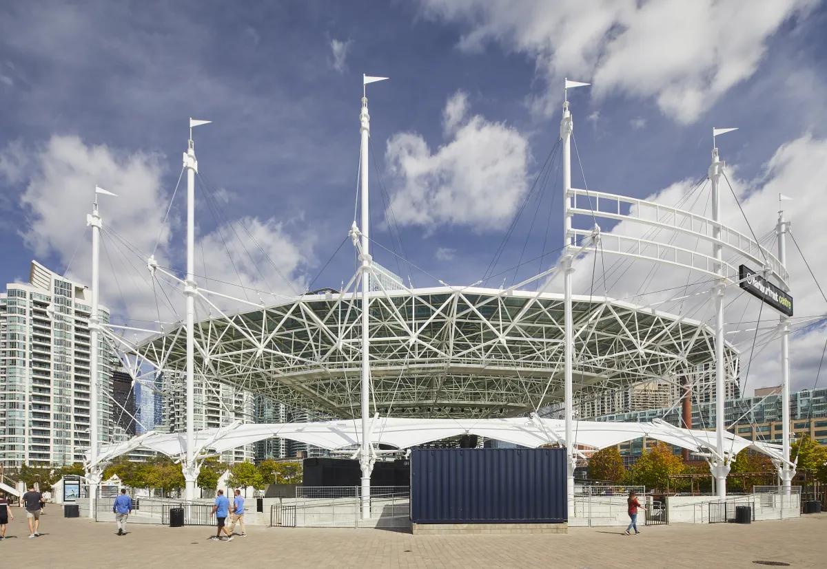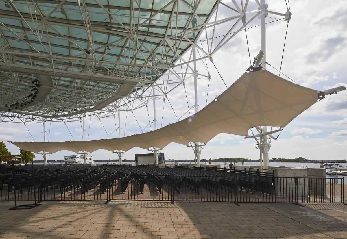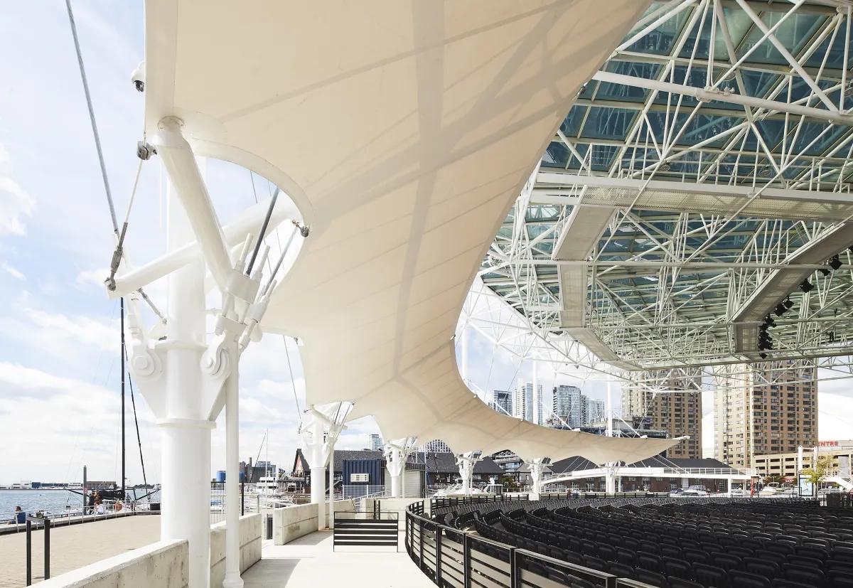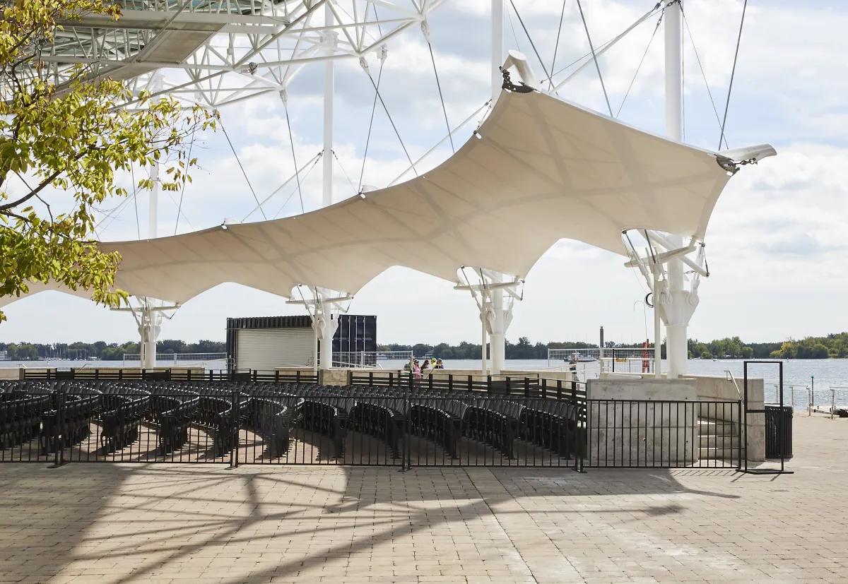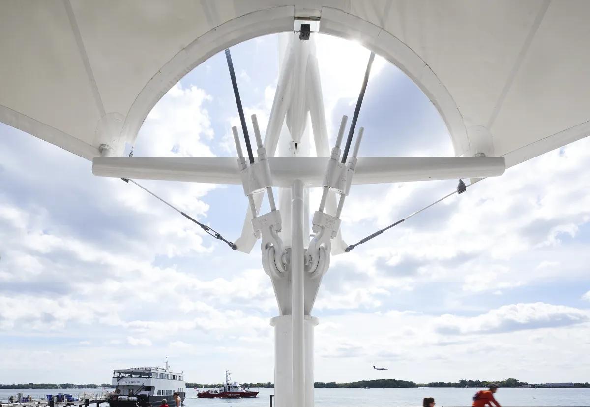 The project is a renovation to the iconic Harbourfront Centre stage to add a raised seating gallery and more rain protection while maintaining its silhouette. Designed with architect Athos Zaghi, the new fabric membrane canopy is wholly supported by the existing masts. Its system of struts, cables and fabric act as a closed system to prevent the need for tie downs. To achieve this, Blackwell worked closely with the engineer of the original structure, Peter Sheffield. By creating a design without masts or tie downs, the circulation and seating beneath the canopy was free to be reimagined by the architect. Given the tight intermingling of the new and existing structural elements at each mast, Blackwell also led the design of the rainwater diverter system to weave in between these systems.
