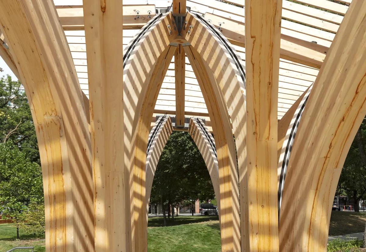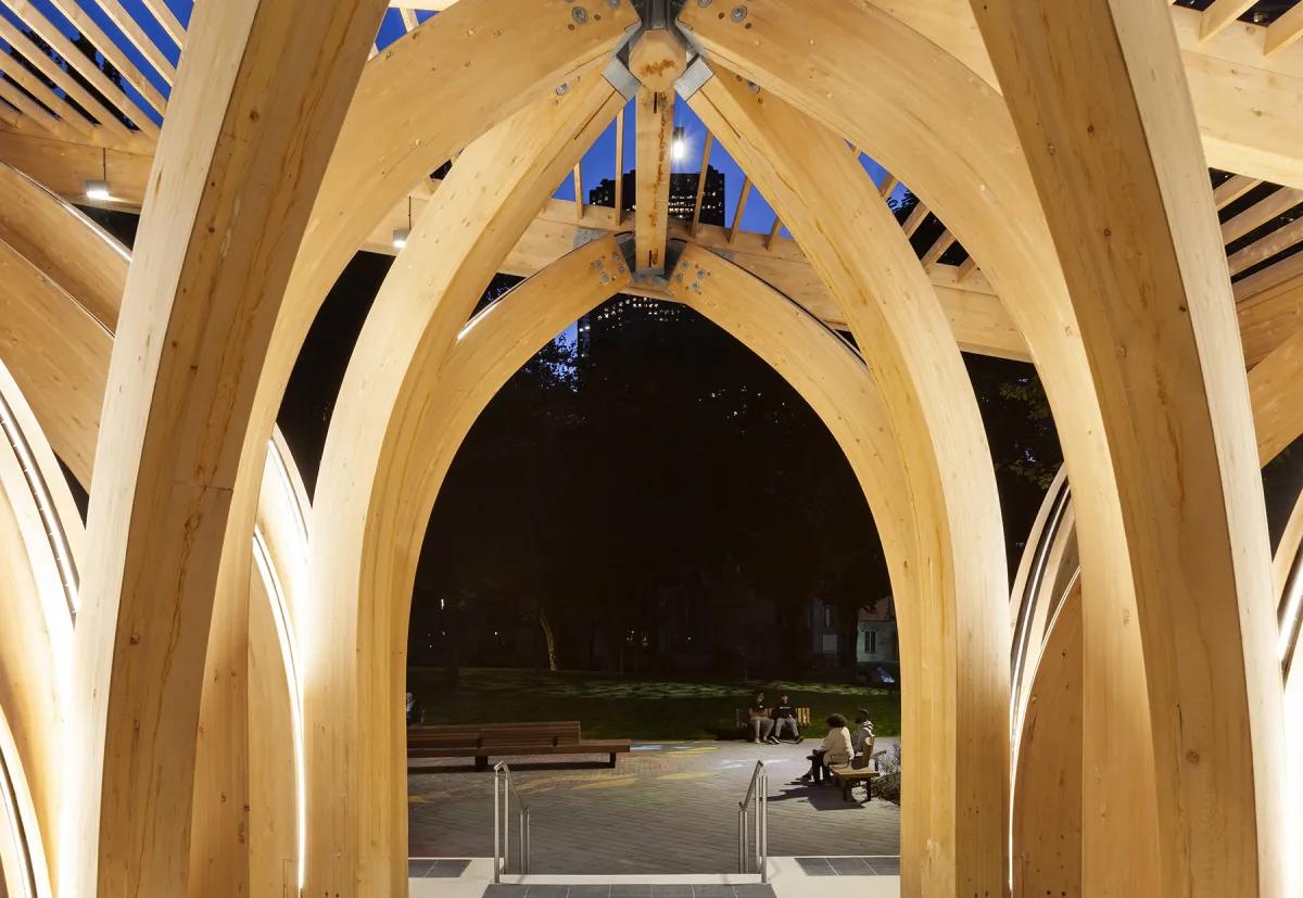The form of this pavilion takes its cues from the neighbouring St. James Cathedral, with the Glulam arches of the new pavilion mirroring the gothic styled arches of the cathedral. The pavilion's superstructure consists of 16 glulam arches with an undulating wood trellis roof, providing an open air space below for park visitors.